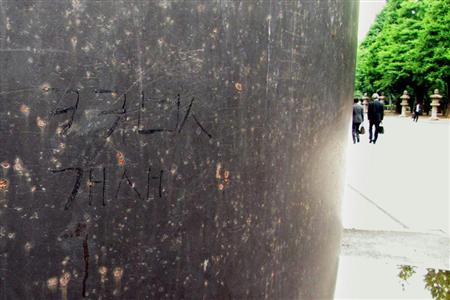 「犬畜生」…靖国神社にハングルで http://livedoor.blogimg.jp/abechan_matome/imgs/8/8/8809e317.jpg 靖国神社の大鳥居にあったハングルの落書き=28日午後、東京都千代田区(小野淳一撮影) 靖国神社(東京都千代田区)の大鳥居の柱に、侮蔑表現ととれるハングルの落書きが見つかっていたことが28日、関係者への取材で分かった。靖国神社は警視庁に被害を相談。警視庁は器物損壊容疑にあたる可能性もあるとみて調べている。