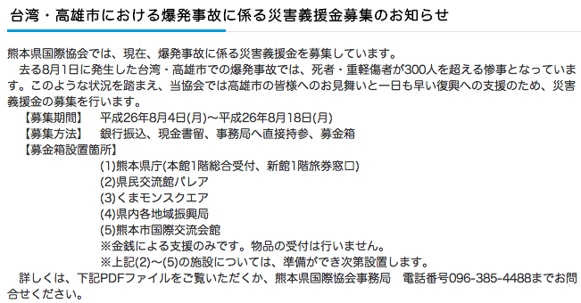 銀行振り込みにも対応しているようですので、ネットバンキング等からも振込可能と思います。 加油、台湾! 加油、高雄! 石川県の加賀市が高雄ガス爆発義援金口座開設→詳細はコチラ 熊本国際協会が高雄ガス爆発義援金口座開設→詳細はコチラ 群馬県が高雄ガス爆発義援金口座開設→詳細はコチラ http://www.pref.gunma.jp/contents/000295541.jpg