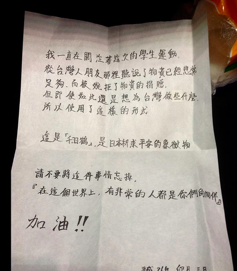千羽鶴を受け取った立法院の学生さんや、多くの台湾人の方々が感動しております! この話題が投稿されているFacebookページ?島國青年陣線の千羽鶴の写真には、現時点で、27000件以上の「いいね!」と、500件を超えるコメントが寄せられ、投稿は1000回近くシェアされています。 千羽鶴を送ってくださいました日本人の方、本当にありがとうございましたm(_ _)m この方に頂いたメールを、一部ご紹介させていただきます。(ご本人の許可を得て掲載しております。) 突然のご無礼をお許しください。 いつも興味深く貴方様のブログを拝見させていただいております。 本日は、質問がありこうしてメールを送らせていただきました。 管理人様の心温まる台湾への贈り物に感銘を受けました。 いつも仲良くしてくれる台湾へ恩を返したい。 私も同じ気持ちです。 今現在、日本で行われている台湾応援に駆けつけたいのですが、母に強く止められ…いえこれは言い訳ですね。 私は臆病者ゆえこういった運動に参加するのは正直怖いのです。 でも、なにかできないかと悩んで、そうだ日本の伝統的な「折り紙」でつるを 折ろうと思いました。 邪魔になるかもしれないですが、少しでも疲れきっている誰かの心の癒しになっていただければ嬉しい。 そう思い、台湾へ送りたいと思い立ちました。 しかし、探してみても物資を預かる場所の住所が分かりませんでした。 フェイスブックを見て翻訳してみても恥ずかしながらよく分からず… もし宜しければ、貴方様が送った住所やルート、重さや台湾への道のり金額などの教えていただきたいのです。 このような不躾をしてしまい大変恐縮ですが、ご返事いただけたら嬉しいです。 お忙しい中、長い文を読んでいただきありがとうございました。 何卒、よろしくお願い致します。 忙しい中、ご返信いただけて恐縮です。 はい、もう折り紙の準備は出来ております。 鶴だけではなく、お菓子類も送ろうと思いそちらも準備しました。 郵便局やクロネコに聞いてみたいと思います。 ただ、住所が曖昧で……(住所省略)に載っているこれは住所でいいのかなと未だに悩んでいます。 ご返信が遅くなり申し訳ありませんでした。 確実に届いてからご連絡をいれようと思っていましたのでこのような時間になってしまいました。 先ほど郵便局の追跡を見ていたら「お届け済み」と書いてありました笑 ドキドキしながら見てたのでほっとしております笑 ご連絡先を教えていただき誠にありがとうございました。 未だ決着がつかない戦い 学生さんたちの精神や体力はもちろん、心の決意を思うと本当に苦しいです。 管理人様もどうかお体に気をつけてください。 貴方様の現地の情報に毎日胸を撫ぜ下ろしたりしています。 見守ることしか出来ませんが、最後まで応援します。 どうか心が寂しくなったとき、共に居ることを忘れないで前を向いてと 元気の無い人がいたのなら伝えてください。 最後までお願いばかりで申し訳ありません。 いろいろと心を砕いていただいて本当にありがとうございました。台湾国の未来を祈っております。 今回、宛先の確保をしていただいて初めて直接な気持ちを送れる事ができました。 ニコドウで応援しているのも素敵ですが、やはりどうしても『形』で応援してあげたかった。 …こんな私でも少しでも役に立てたかもしれないことが皆に広がれば応援のしかたも違って くると思います。 そしてそれを変えることが出来るのは人望が厚い貴方様にしか出来ないことです。 あと少し教えていただきたく。 学生さんたち千羽鶴を迷惑に思ってませんでしたか? 送ったのはいいけれど、やはりそこは私の独断で決めたことでしたから 手伝ってくれた母が「けどあちらさんの邪魔にならないの?」と一言の呟きにもう心配で心配で やっぱりお菓子だけとかのが良かったのかな…とかもう気持ちが悶々しております汗 正直に教えていただけると幸いです笑 反省してます。 長々と失礼しま した。 お忙しい中、本日はありがとうございました。 この勇気ある行動は、確実に台湾の学生さん達の心に響いています。