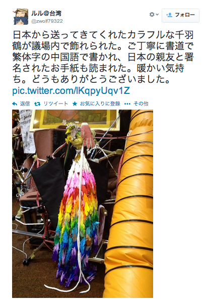終わりのみえない戦いですが、学生さん達は諦める事なく厳しい環境の中、抗議を続け ています。 P1200040 この記事の続きを読む · 【台湾の反応】今がそのときだ!!!勇敢な 台湾人よ!!!台湾人に勇気を与え続ける『島嶼天光』ひまわり学生運動主題歌!!!世界中が .. (以下、Facebookの?島國青年陣線に投稿された内容の翻訳です) 本日、また日本のお友達から贈り物を頂きました。 (千羽鶴に添えられた手紙) 私はずっと今回の学生運動を注視しております。台湾人の皆さんからの話で物資は既に足りていて、物資の受付は行っておりませんと聞きました。しかし、私は台湾の為に何か出来ないかと考え、今回このような形をとらせて頂きました。これは「千羽鶴」です。日本では平和の象徴です。この世界中には、非常に沢山の仲間達があなた達の側にいる事を忘れないで下さい。頑張って下さい!! 「千羽鶴」聞くところによると、1000羽折り鶴を折ると願い1つ叶うという。 こんな時、あなたなら何をお願いしますか? 台湾の立法院へ千羽鶴を送ってくださったこちらの日本人の方と、台湾の反応ブログ管理人は、十日ほど前からメールのやりとりを行っておりました。この方の千羽鶴が、無事に立法院へ届きましたことを非常に嬉しく思います。