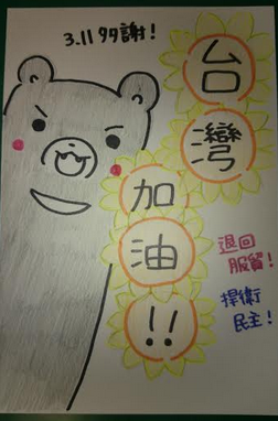 前回記事 【拡散希望】立法院の学生さんへ「ひまわり応援メッセージ」を送りましょう!!! 海を越えて想いは届く!!!台湾ひまわり学生運動を応援する、ひまわり応援団発足!!!は→コチラ 皆さんから写真で頂いた「ひまわり応援メッセージ」を紹介させて頂きます。 http://livedoor.blogimg.jp/taiwannohannou/imgs/7/c/7c77f300.pnghttp://livedoor.blogimg.jp/taiwannohannou/imgs/a/7/a71b5ee9.png