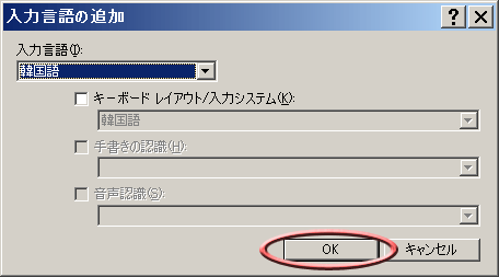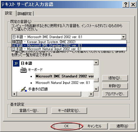 ¦¡Ú£¡Û¤Î¥¦¥£¥ó¥É¥¦¤ËÌá¤ê¤Þ¤¹¡£¡ÚÀßÄê¤Î¸À¸ì¡Û¤Î¢§¥Ü¥¿¥ó¤ò¥×¥ì¥¹¤·¤Æ¡Ú´Ú¹ñ¸ì-Korean Input System(IME2002)¡Û¤¬¤¢¤ì¤Ð¡Ú£Ï£Ë¡Û¥Ü¥¿¥ó¤ò¥¯¥ê¥Ã¥¯¤·¤Þ¤¹¡£¤³¤ì¤Ç¡¢¤â¤¦²¿»þ¤Ç¤â¥Ï¥ó¥°¥ë¤¬ÂǤƤë¾õÂ֤ˤǤ¤Þ¤¹¡£