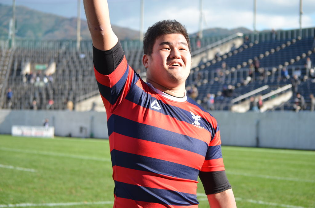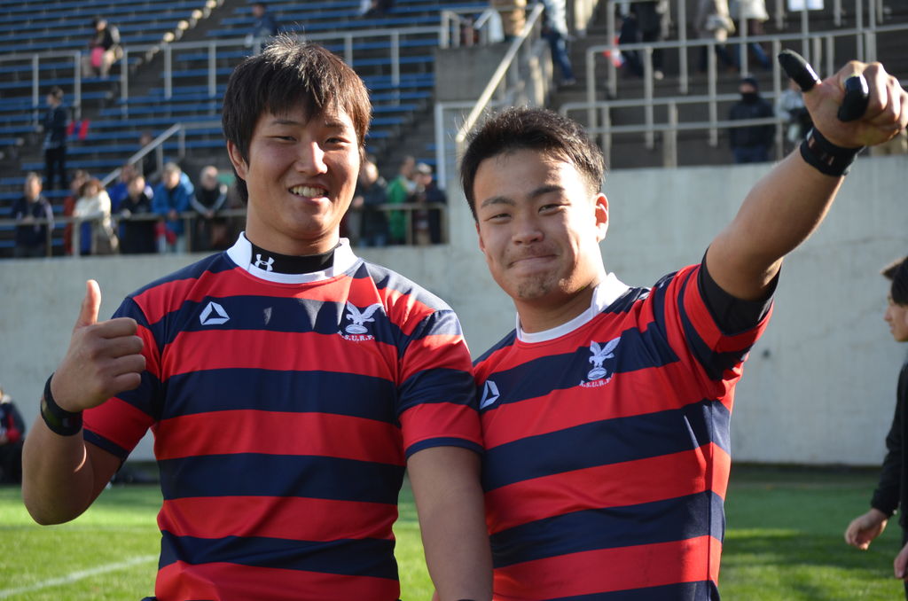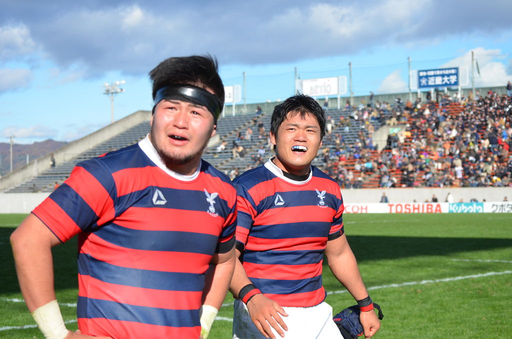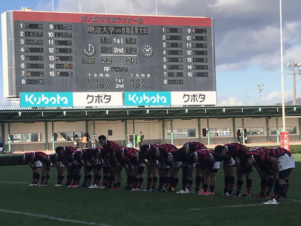(ラグビー部)12月11日@花園球技場 第53回大学選手権大会 3回戦 対明治大 試合結果「京産大26−22明治大」 http://livedoor.blogimg.jp/ksu_athletic/imgs/a/f/af6498c2-s.jpg 新たな歴史の扉を開いた。『眞野組』の躍進で、赤紺フラッグが花園を舞う。 http://livedoor.blogimg.jp/ksu_athletic/imgs/a/d/ad4cca74-s.jpg (スターティングメンバー) 1.柴田知宏(3年 桂) 2.中川将弥(3年 御所実) 3.細野裕一朗(4年 京都学園) 4.伊藤鐘平(1年 札幌山の手) 5.山野将太朗(4年 京都成章) 6.眞野拓也(4年 東海大仰星) 7.李智栄(4年 大阪朝鮮) 8.フェインガ・ファカイ(1年 日本航空石川) 9.貴島由良(1年 京都成章) 10.高原慎也(4年 桂) 11.濱田将暉(2年 京都成章) 12.松本拓也(4年 大商大高) 13.下良好純(4年 東海大仰星) 14.坂本英人(3年 御所実) 15.森田慎也(4年 洛北) (試合展開) 創部から過去6戦6敗と、苦手意識のあった明治大を相手に聖地・花園で身体をぶつけ合う。試合開始直後、緊張からかミスを連発。開始7分で2トライを献上してしまう。0−12となり、雲行きが怪しくなったが選手たちは前を向く。 試合の転機は、最初のスクラム。強力FWを持つ明治大を相手に押し負けない。むしろ押し勝っているように見えた。やはり頼りになるのは「京産大のFW」だった。ボールを出し入れするSH〔9〕貴島が言う。「(ボールを入れるので)横から見て、スクラムは完全に京産大が勝っていた。レフリーも何度か明治に注意していました」。FW陣8人が「一枚岩」になって押し込む。厳しい練習を重ね、自信をつけてきたスクラム。関東勢が相手だろうが、そう簡単には負けない。 FW陣がプレッシャーを掛け続けた「成果」が早くも現れる。前半27分。赤紺が「勝利の方程式」を開拓する。ラインアウトをHO〔2〕中川がまっすぐに投げ込み、長身のLO〔4〕伊藤が持ち上げられてキャッチ。ボールを掴んで仲間に渡すと、すぐさまモールを作る。もう、こうなったら止められないのが運命だった。 赤紺フラッグで埋め尽くされたスタンドから「押ーせ!押ーせ!」の声援と共に、自慢のモールが炸裂。 動き出した足は止まらない。紺白の明治が後ずさり。前に押し返すタイミングすら与えない、完璧なモールを形成。一番後ろで楕円を持つのはNo・8〔8〕フェインガ・ファカイ。前で押し込む7人の陰に隠れるように、一歩ずつ進んでいく。しまいには、ゴールライン手前まで押し込んでいく。そして「今だ!」と言わんばかりに背番号8が飛び出す。もう一息のところで相手のタックルが入り、ボールを置く。それを〔9〕貴島が持ち出しゲインに成功。〔2〕中川が繋ぎ、何とかマイボールで粘る京産大。最後は再び〔8〕ファカイの登場。明治のディフエンスをぶち破り、渾身のトライ。FB〔15〕森田が駆け寄り、何度も〔8〕ファカイの頭をなでる。嬉しそうに両手を斜め左45度に上げ「フェインガポーズ」。スタンドも総立ちで祝福する。この光景が赤紺戦士にさらなる自信を持たせ、火をつけた。 SO〔10〕高原が普段通り、落ち着いて蹴り上げる。右足から放たれた楕円はHポールを通過。2人の審判が旗を揚げると、歓声は大きくなる。「ナイスキックー!」大声を張り上げ、赤紺の背中を押す。 すると前半31分。波に乗った京産大は留まることを知らない。再び〔2〕中川の投じたラインアウトを〔4〕伊藤が落ち着いてキャッチ。もう、ここからは「宝の技」を出す。FW陣8人に加え、〔9〕貴島とCTB〔13〕下良がモールに参戦。ここにCTB〔12〕松本が後方からやってくる。「押ーせ!押ーせ!」の歓声は先程よりも大きくなる。工夫を重ねたモールで明治大を圧倒。〔8〕ファカイがゴールラインに飛び込む。〔4〕伊藤とLO〔5〕山野が「力を出し切った」と充実感で満たされる。握った拳を天に突き上げて叫んだ。またしても〔8〕ファカイは両手を斜め45度に上げ「フェインガポーズ」。動き出したら止まらない「秘伝モール」。ここまで成長していることに、選手たちは自身を持っていい。 〔10〕高原がコンバージョンキックを決め、14−12と逆転に成功。一気にスタンドが「京産コール」に包まれた。 しかし前半終了間際、明治大にラック中央をスルッと抜けられトライを献上。前半を「京産大14−明治大19」で終えた。ハーフタイムが10分を過ぎ、選手たちがフィールドへ。先にグラウンドへ出てきたのは、勝気に満ち溢れた赤紺ジャージだった。15人で円陣を組み、4度も仲間で吠える。 1トライ差、5点を追って後半がスタートする。烈しいタックル、素早いチャージ。FL〔7〕李の猛タックルが目立つ。幾度となく明治大の攻撃にも応戦。スクラムでも完全に相手を押し切り、京産大は徐々にペースを掴む。〔2〕中川がレフリーにプレーの確認をして、FW陣を落ち着かせる。 すると後半15分。自陣できっちりとディフエンスを重ね、ターンオーバー。 WTB〔11〕濱田が右サイドを駆け上がり前進。ここから〔9〕貴島のパスワークが光る。左へ展開してWTB〔14〕坂本へ。4人の相手選手を引きつけながらも粘りをみせ、右に切り返し展開。〔15〕森