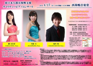 http://nishisugamo-ongakudo.com/wp-content/uploads/2016/02/4.17-300x212.jpg 東京芸術大学に在学中の3人のピアニストたち。 復興への願いを音にのせて・・・ ※本公演の収益は全て東日本大震災復興支援活動に寄付いたします。