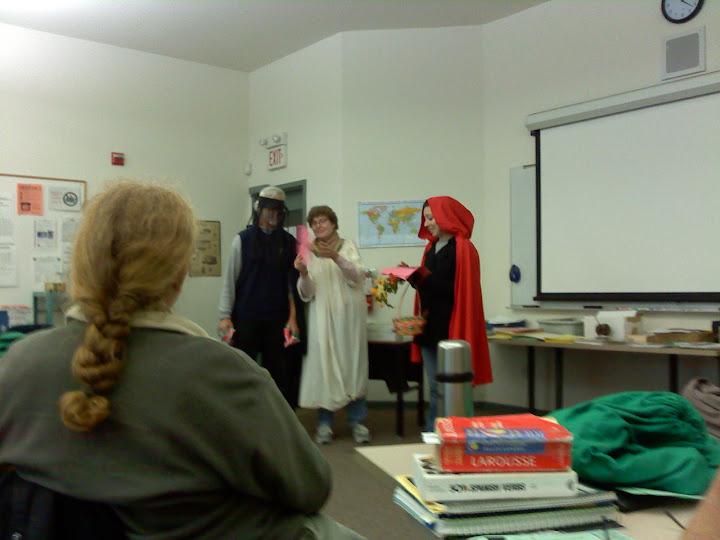 私のグループは出来の悪い私がいるせいで、一番短い「ジャックと豆の木」でした。私はその中でも一番セリフの短い「お母さん役」。それでもセリフのところどころで泣いたり大喜びしたりする身振りを入れたりは、やってのけていたので、結構うけてました。