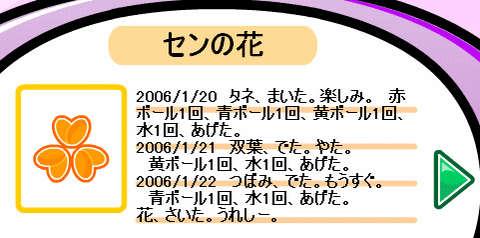 肥料?は、赤1回、青2回、黄2回、水3回でした。12時間ごとに変化してしまうので、 中々12時間ごとみるのはたいへんです;^_^A。 これらの上げ方によって咲く花、もらえるギフトが違うようですねー。 http://www.iris.dti.ne.jp/~tmsuzu/blog/habo52.gif 今回はこういうものをもらいました。また違うものがもらえるようがんばろう!! 情報あったら教えてくださーい。 http://www.iris.dti.ne.jp/~tmsuzu/blog/habo51.gif ハーボット