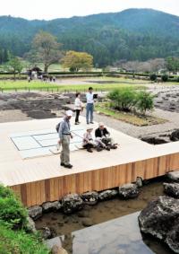 普段は入ることができない庭園部分に、戦国時代にあった館の高さに床を設置。