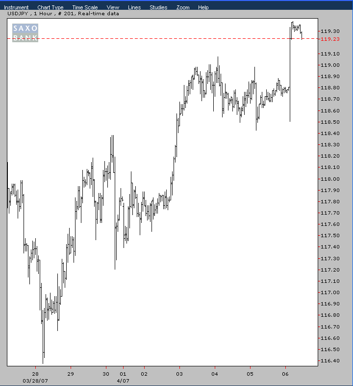 6日のニューヨーク外国為替市場で円相場は下落。前日比55銭円安・ドル高の1ドル=119円20―30銭で取引を終えた。米雇用統計が上振れしたことを受け円売り・ドル買いが出た。対ユーロでは最安値を更新した。 午前8時半に米労働省が発表した3月の雇用統計で、非農業部門の雇用者数は前月比18万人増と市場予想(14万2000人程度の増加)を上回った。過去の雇用者数の増加幅が上方修正されたうえ、失業率は4.4%と5カ月ぶりの低水準となった。 米景気の先行き不安を和らげる内容として、指標発表後に円売り・ドル買いが加速した。一時は 119円39銭まで売られ、2月27日以来の円安・ドル高水準を付けた。 雇用統計を手掛かりにした売買が一巡した後は小動きとなった。6日は聖金曜日で債券市場は短縮取引、株式市場は休場。外為市場でも市場参加者が少なかったという。市場では「週明けの株式相場の反応を見極めたい」(外為ディーラー)との声が聞かれた。この日の円の高値は118円79銭だった。 円は対ユーロで5日続落。前日比15銭円安・ユーロ高の1ユーロ=159円50―60銭で取引を終えた。 一時159円68銭まで下げ、1999年のユーロ導入以来の最安値を更新した。円が対ドルで売られ、 対ユーロでも円売りが出た。 ユーロは対ドルで3日ぶりに反落。前日終値の1ユーロ=1.34ドル台前半から1.33ドル台後半に水準を 切り下げた。米雇用統計をきっかけにユーロ売り・ドル買いが優勢になった。前日に約2年1カ月ぶりの ユーロ高・ドル安水準を付けていたため、ドル買い戻しも入りやすかった。この日のユーロの安値は 1.3364ドル、高値は1.3426ドル。 株価チャンネル (クリックお願いします!) ← 大勢の個人投資家と力を合わせて戦うために、ご協力を!! |