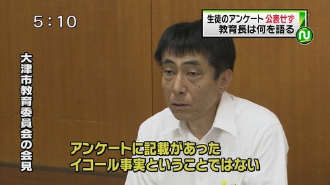 > PTAの緊急保護者会で、ネットに公開された加害者名や情報について、今回の件 > や今後同様の事案が発生した場合でも、安易に加害者の情報を外部に漏らさな > いよう学校側から通達がありました。 > それとインタビューに応えたり配布されたプリント等を公開することも固く禁 > 止すると、再再度通達がありました。 > 家庭でも児童の行動を厳しく監視する必要性について議論が交わされ、情報の > 流出を徹底的に抑制する意向が確認されました。 > 最後に人権教育のよりいっそうの強化を各団体に要請して終わりました。 > 今回、問題の保護者は不参加でした。 腐りきっている大津市教育委員会。彼らは、生徒の