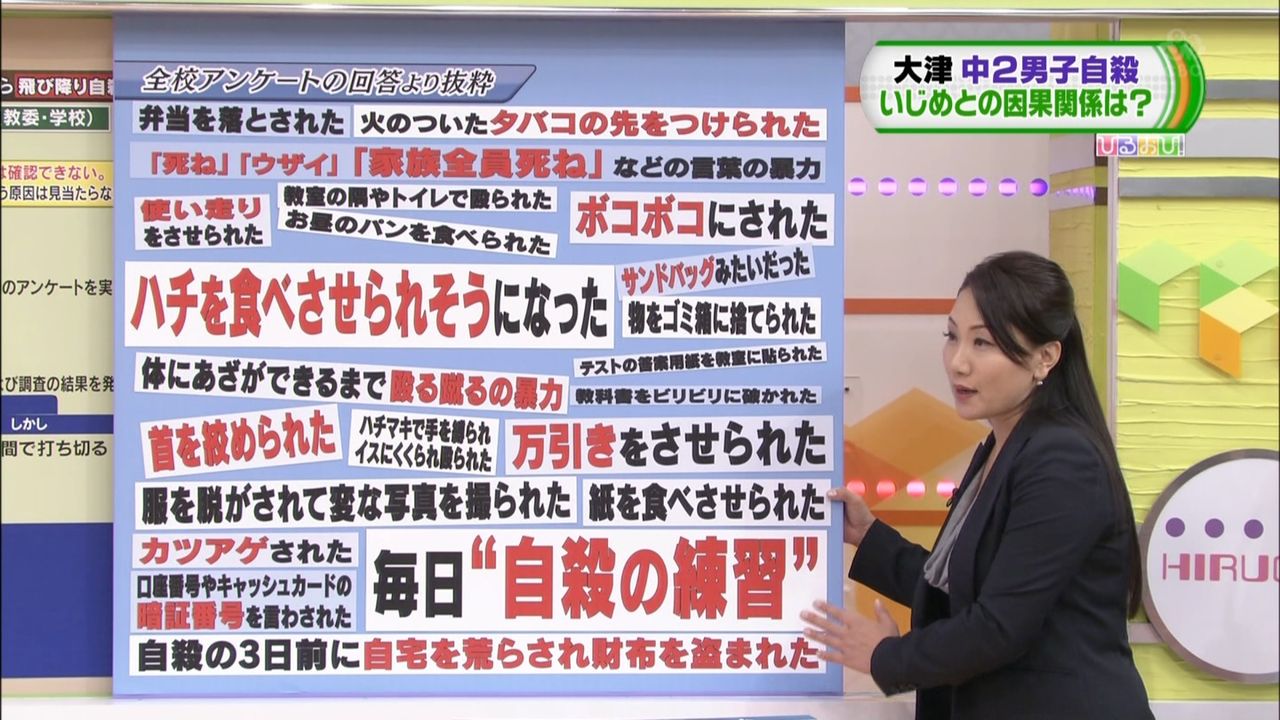 いかに学校側がいじめがあったことをないように装っても、各方面から疑惑の声が上がり2chユーザー始め真実を求める者達の手によって加害者の行為や名前までも明らかにされ、アメリカABCニュースにまで報じられたことを学校側は反省すべきではなかろうかと感じました。 いろいろと調べていると、滋賀県という地域は、中学校で悪質なイジメが