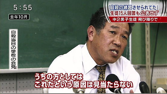 加害生徒への事情聴取大波乱の様相です。 ○○と○○、 事情聴取に自らが雇った人権派弁護士を立ち合わせる事を決めた模様。 あらかじめ練り上げられた筋書にしか答えさせない模様。 都合の悪い質問は黙秘で、って決めてるよ。事情聴取は加害者父母と加害生徒、人権派弁護士立ち合いのもと、加害者に都合よい状況で進められます。 加害生徒はいじめはなかった、金は自らの意思で引き出した、 暴行と捉えられる行動は、全てふざけあいの範囲で、と口裏合わせの会議(麻美と美恵とその周囲の人間)して決めてあります。 ただ晃也の親はその会議には呼ばれなかった。 いざとなれば一番評判悪い晃也にすべてなすりつける算段です。 澤村憲次教育長の発言集