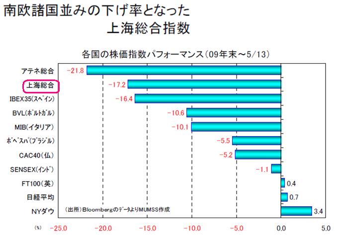 ユーロの暴落も気になるところですが、それ以上に気をつけないといけないのは、メルトダウンを 始めた上海株式市場です。 上海総合株式市場 −136(−5.07%:終値2559) 上海万博開催中でありながら、上海株が棒下げ状態になりつつあり、今日は、とうとう5%を 超える下落を見せています。 また、【ハンセン指数】も430ポイント急落し(−2.13%)、19,715で終わり、 2万ポイントの大台を割り込んで引けています。 アジア市場からリスクマネーが逃げている証拠であり、日経平均も1万円大台割れを視野に 入れてきました。 まあ、株式については、1万円台割れは、買いのチャンスだと考えています。 中国の金融引締め政策、そして、中国の不動産価格抑制のための不動産税が、中国へ導入される という噂が、あります。これが、今後の相場の最大の下げ材料になるはずです。 この悪材料が出たところが、買いのチャンスかな???と考えるのですが・・・・。