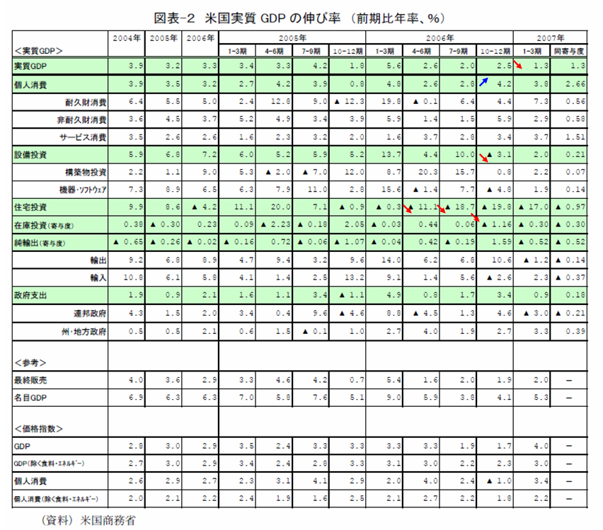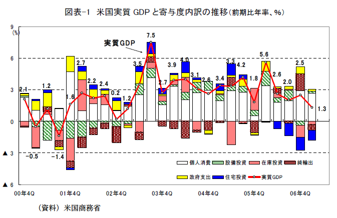 株価チャンネル(クリックお願いします!) ← 大勢の個人投資家と力を合わせて戦うために、ご協力を!! 4月27日発表された1-3月期のGDP(速報値)は、前期比年率+1.3%と直前の市場想(+1.8%)を下回り、10-12月期の同+2.5%から低下した。イラク開戦時の2003年1-3月期の同+1.2%以来4年ぶりの低水準と なり、景気減速を強めるものとなった。 GDPを引き下げた最大の要因は住宅投資で、前期比年率▲17.0%の大幅減少となった。 前期の同▲19.8%ほどではなかったものの6四半期にわたってマイナスが続き、特にこの4四半期は 二桁のマイナスが続くなど住宅市場の調整の大きさを窺わせるものとなった。 第二の要因は純輸出である。原油・石油製品を中心に輸入が増加に転じた一方、資本財や工業用原材料の低下で輸出が減少したため赤字が膨らんだ。寄与度では▲0.52%と10-12月期+1.59%から大きく落ち込み、住宅投資の同▲0.97%に次ぐマイナスとなった。なお、在庫投資は寄与度▲0.3%と10-12月期 同▲1.16%からマイナス幅を縮めた。 2007年1-3月期の米国経済は、10-12月期と同様に住宅市場の冷え込みと製造業の不振が重なり減速懸念が 強まっていたたが、結果として、景気の一層の減速が確認された形となりました!! 一方、純輸出(前期+1.59%→▲0.52%)と在庫投資(前期▲1.16%→▲0.30%)であり、これらを除い た最終販売では前期+1.9%から1-3月期+2.0%とむしろ若干上昇しており、実質的な内需の強さでは、 低水準ながら横ばい状況が持続していおり、引き続き米国の内需は、底堅いことが確認されました!! 今後は、4-6月期以降の景気動向に焦点が移行しようが、今の所、雇用所得に裏付けされた堅調な 個人消費が、急速に失速する可能性は少ないと見られ、景気は減速気味ながら、しばらく低空飛行を 続けるものと思われる。 設備投資、住宅投資は、減速し、現在、在庫調整に入った米国景気。しかし、個人消費は、加速して