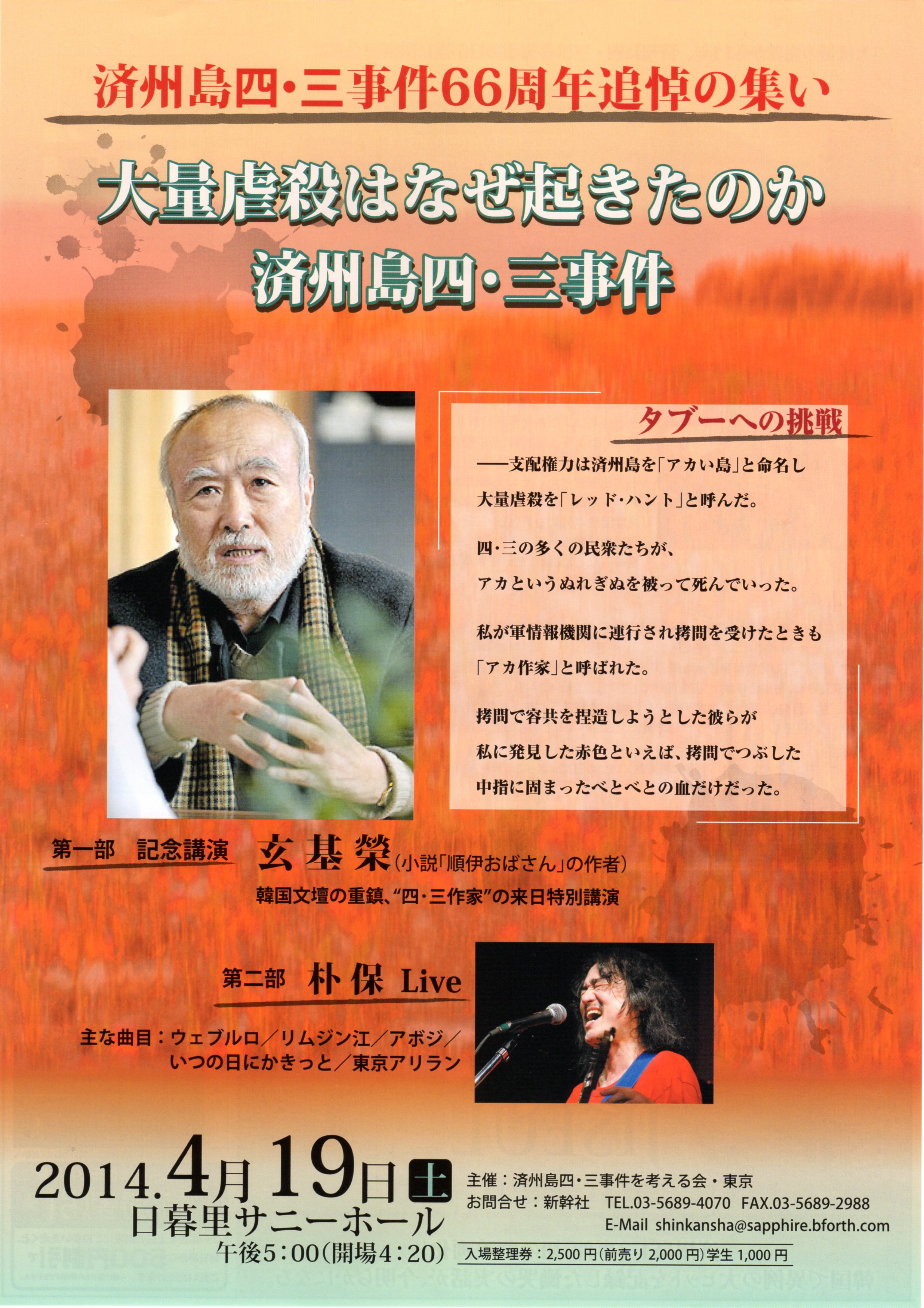 済州島四・三事件66周年追悼の集い−大量虐殺はなぜ起きたのか済州島四・三事件 日暮里サニーホール (日暮里) http://www.sunny-move.com/ 第一部 記念講演 玄基榮(小説「順伊おばさん」の作者) 第二部 朴保(vo.g) 朴実(g) 大村太一郎(b) 清水達生(ds) 柴田エミ(pf) 磯部舞子(vln) 開場16:20/開演17:00 入場整理券:2,500円(前売り2,000円) 学生1,000円 主催:四・三事件を考える会・東京 問合せ:新幹社 TEL 03-5689-4070 FAX 03-5689-2988 Email shinkansha@sapphire.bforth.com