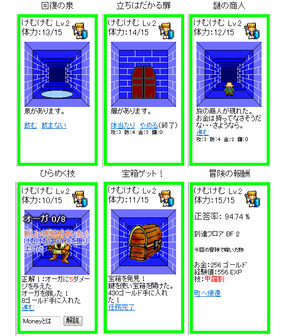 ドラクエ風RPG型クイズゲーム<無料>※漢字、英語、地理、歴史、計算、などなど・・・いろんなダンジョンで遊べます。 ◆キャラクター色々◆http://www.kuri.ne.jp/game/exp_img/caras.gif ◆アイテムいっぱい◆http://www.kuri.ne.jp/game/exp_img/items.gif ◆多くのモンスター◆http://www.kuri.ne.jp/game/exp_img/mons.gif ◆謎にみちたダンジョン◆http://www.kuri.ne.jp/game/exp_img/dans.gif ◆闘技場でライバルと対決◆http://www.kuri.ne.jp/game/exp_img/taisen.gif ◆レシピを見つけてアイテム作成◆http://www.kuri.ne.jp/game/exp_img/recipi.gif ◆ちょっと遊んでみる◆ちょっと遊べるサイトへGO! ◆自分のキャラクターを作る◆自分のキャラを持てば携帯から遊べたり、町で買い物や酒場で会話などが出来ます。 Copyright (C)ナッツスプレッド・ワールド. All Rights Reserved.
