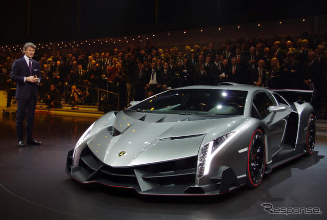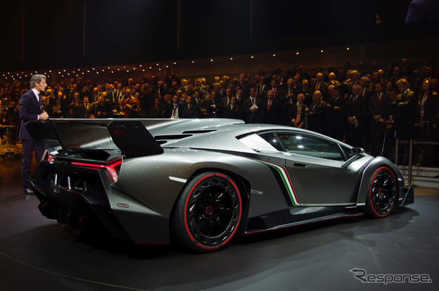 ランボルギーニは4日、新型スーパーカー『ヴェネーノ(Veneno)』を発表した。最大出力750hp、0-100km/h加速は2.8秒、最高速度は355km/h、価格は300万ユーロ(約3億6500万円)超という文字通りのスーパーカーだ。