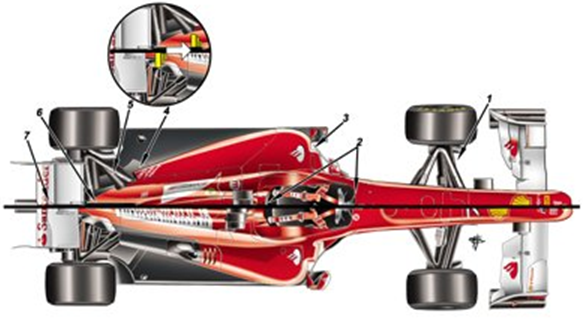 http://livedoor.blogimg.jp/markzu/imgs/4/5/452f9473-s.png F150のシャシーが高くなり、ノーズは平坦になっている(上)が、 フロント・ウィングは、昨シーズンのF10(下)の最終バージョンである。 新しいフロント・サスペンション(1)は高いウィッシュボーンを 有しており、フェラーリにとって初めてステアリング・アームが 上部ウィッシュボーンの内側に入っていない。 視界を改善し、燃料タンクのための空間を増やすため、ドライバーは コックピットでより垂直に座る(2)。 サイドポッド(3)は貫通保護が向上し、吸気口は昨シーズンの マクラーレンと同様のスタイルに成形されている。 マシンのリア、「コークボトル」セクションは幅が広くなり、シーズン前に さらに変化するであろう排気管は、非常に低い位置にある(4)。 フェラーリは2011年もプッシュロッド・サスペンション(5)を継続しているが、 ギアボックスのサイズを縮小し、ダンパーとロッカーの取り付けは 15cm前に移動した(円内)ため、非常にコンパクトなパッケージングで プルロッド・サスペンションと同じメリットを得られる。 リア・ウィングとディフューザ前の領域(6)は、気流を改善するために 狭められた。 リア・ウィングとディフューザ自体は一時的なソリューションに 過ぎないので、チームはマシンを走らせて、その信頼性を テストすることができる。 開幕戦までにアップデートされたバージョンが搭載されるだろう。 |