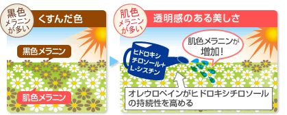 「ヒドロキシチロソール&L-シスチン」が透明感のカギ“肌色メラニン”をつくりだします。 さらに「オレウロペイン(ヒドロキシチロソール持続化成分)」を配合し、「ヒドロキシチロソール」の持続化を助け、透明感へのアプローチが長く、効率よく続きます。 以上 私のお気に入り商品 2点の紹介でした