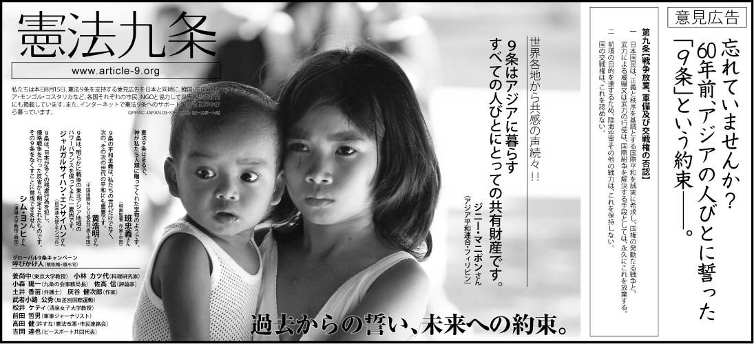 世界12紙で9条をサポートする意見広告を掲載2005年8月15日、日本が戦争を止め、平和への道を歩み始めてから60年を迎えるこの日に、もっともっと9条を世界に広めるために、そして、日本に住む私たちも、もぅ一度、9条のことを見つめ直すきっかけに、各国の新聞に「憲法第9条」を掲載しました。 |