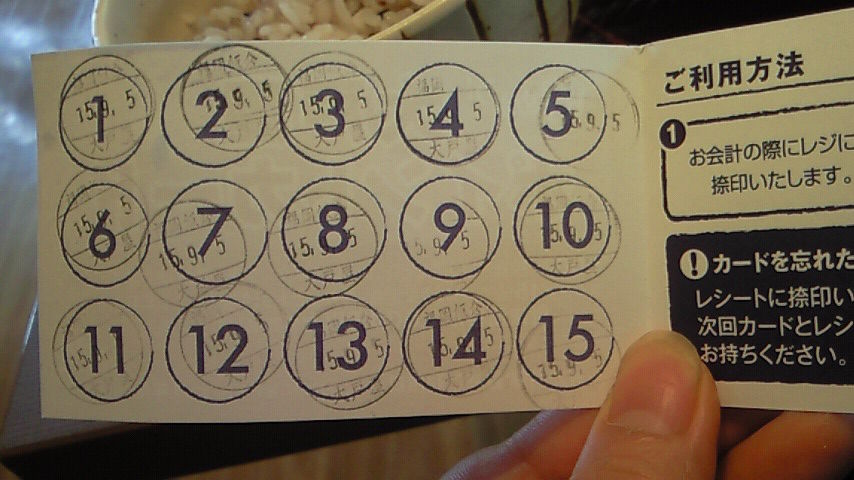 おおとやに行きました。このポイントカードは500円で一個スタンプを押してくれて、15個たまったら一品料理が無料になるのです。(1000円以内超えると手出しだったかと)