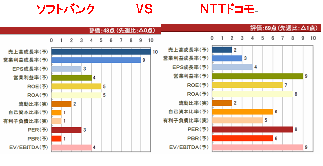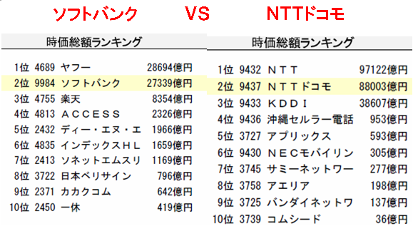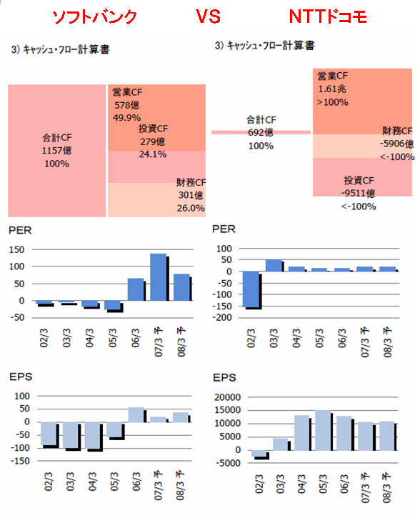 電気機械に精密機械、そして輸送機械(自動車)の生産性が、急改善中!! あれぇ〜??どこかの国の、今の株価の動きに、似ているような??!! 通信業だって、TFPは、急改善中!!しかし、株価は、現状、反応していないような!! 産業別労働生産性だって、情報通信業は、全産業比、ずばぬけて高いんだけれど!! masaの注目点!!注目!! NTTドコモは、98%携帯事業に依存。 ソフトバンクは、ネット事業に幅広く、事業展開!! もっと、注目してほしいのは、平均年齢と平均給与!! ソフトバンク 平均年齢34歳で、平均給与910万円 NTTドコモ 平均年齢35歳で、平均給与804万円 スーパーなどの流通業の上場企業の平均給与が500万円そこそこなのに対して 高い平均給与!!やはり、成長業種に優秀な??人材が集まるという証拠か?? 時価総額で、比較すると、NTTドコモは、ソフトバンクの約3倍!! 売上規模で、約4倍。営業利益で、約10倍、NTTドコモが、圧勝!! 注目すべきは、NTTドコモの利益率!!12.8%と、極めて、利益率が高い!! 製造業で、5%あればいいほうだから、ネット業界や通信業界は、儲かっていることがわかる!! しかも、NTTドコモは、売上規模がでかい!! 財務体質を見ると、NTTドコモの圧勝となる。NTTドコモは、なんと、自己資本4兆円!! 対するソフトバンクは、たったの??2400億円!!横綱と平幕の違いだ!!http://www.geocities.jp/de0tx/_gl_images_/shin17.gif masaの分析それでは、株式投資で、最も重要なキャッシュフローを比較してみよう!!