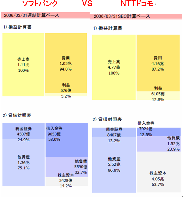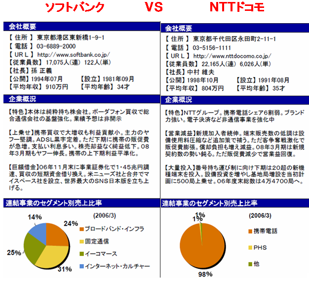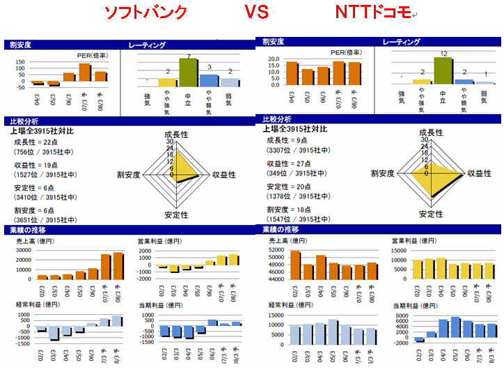 http://www.geocities.jp/de0tx/_gl_images_/shin9.gif株は、その企業の成長性に投資するもの!!よって、未来に向かって、豊富で良質な投資が、できる 企業が、将来、着実に利益を伸ばすことができる!! 言い換えれば、未来に向かって投資をできない企業に、成長は、ありえないのだ!! ここでも、NTTドコモの資金の潤沢さには、驚かされる!! なんと、1.6兆円も、キャッシュを稼いでいる!!⇒ お金余っているよ!! その中から、未来への投資が、約9500億円!!ボーダフォンだって、買収できそうな、資金潤沢ぶり。 さらに、あまったお金で、借入金5900億円返済している。 一方、ソフトバンクのキャッシュの稼ぎは、578億円!!NTTドコモと比べてしまうと、貧弱に みえてしまう!!投資キャッシュフローは、SBIの株を売却してしまったため、投資を回収した形 になっているので、数字の比較はできないが、営業キャッシュフローが、600億円前後なので、 銀行借入200億円できたとしても、800億円程度!!NTTドコモの資金潤沢ぶりが、目立つ!! しかし、NTTドコモは、その資金潤沢さを、うまく利用できていない。 いまだに携帯事業に98%も依存していて、新しい事業を育てていない!! 携帯事業単体では、熟成産業であり、今後新たな伸びは、期待できない!! ソフトバンクの孫社長は、その資金潤沢な通信業界を狙ったのではないか?? もし、ソフトバンクにNTTドコモの営業キャッシュフロー1.6兆円が、移動したら とてつもないことが起きるであろう!! いやぁ〜!!孫さん、博打打ってきたねぇ〜!! ![]() しかし、お金が潤沢なNTTドコモの方が、お金の少ないソフトバンクより、売上成長性、 営業利益成長性が、低いとは、どういうことやネン?? NTTドコモの成長戦略が見えない!!⇒ 株価が低い!! では、あ〜りませんか?? 年老いた??!!