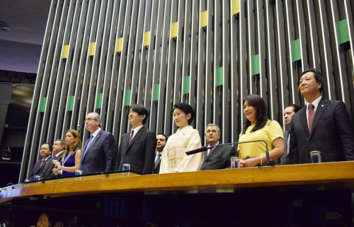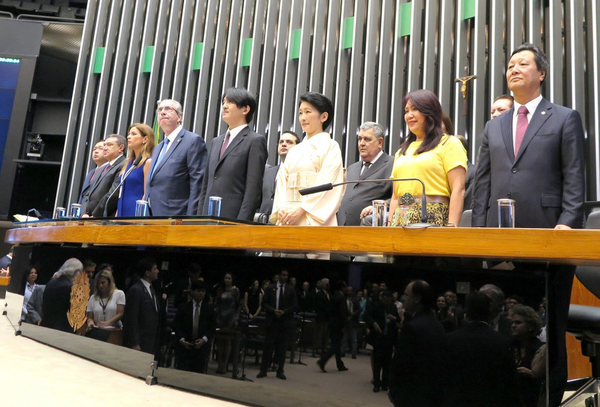 殿下は「日本とブラジルの友好関係は、120年の月日を経てますます堅固なものとなり、両国国民の交流も活発になっております。日本では、現在18万人の日系ブラジル人を中心とするブラジル人が様々な分野で活躍しています。このような双方向の交流促進により、今後、日本とブラジルの絆がさらに強まることになりましょう」との期待をのべられた。 当初の予定にはなかったが西森議連会長も挨拶し、セラード開発やウジミナスなどの国家プロジェクトを列挙し、「両国は経済関係でも太い絆で結ばれている」と企業の役割の重要性を訴えた。 昨日2面で既報のように本会議場外の通路ではクーニャ同議長の盟友フェルナンド・フランシッキーニ下議が英語で大統領罷免を訴えた書面を殿下に説明するなど、異例の場面もみられた。 両殿下はその後、連邦特別区知事夫妻と御引見され、午後はセラード農牧研究センターをご訪問。さらに大使公邸で6州から集まった200人もの日系人と懇談された(後日詳報)。 http://www.nikkeyshimbun.jp/2015/151107-72colonia.html より