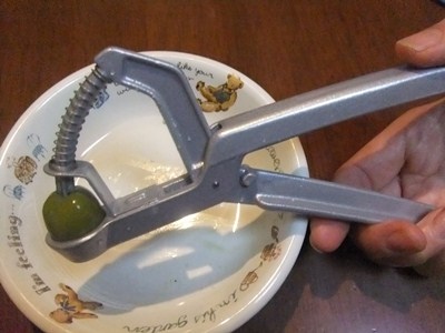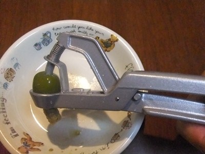 スーパーマーケット成城石井で、今年の新物のオリーブを入手しました。 塩水に漬けこんでいるものですが、口に含むと汁がジュワッと口の中に広がり、最高です!! 丸ままかじるのにはいいのですが、これをお料理に使うとなると、ちょっと大変です。 ヨーロッパの家庭では、ちょうど日本の家庭に大根おろしがあるように、常備されているのがオリーブの種抜き器。前から欲しくてしかたがなかったのですが、ついに売っているお店を発見しました。 それがこれ、ドイツ製です。 早速使ってみました。 こんな感じです。 種はこんな感じで出てきます。 力もいらず、とっても簡単です。 |