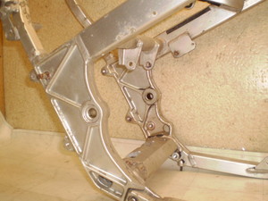 市販車として耐久性を確保するためレーサーよりも肉厚のある アルミパイプを使用したと思う。 そして腐食を防止する表面処理が施された。 YZR500のフレームを量産バイク用にグレードアップするための