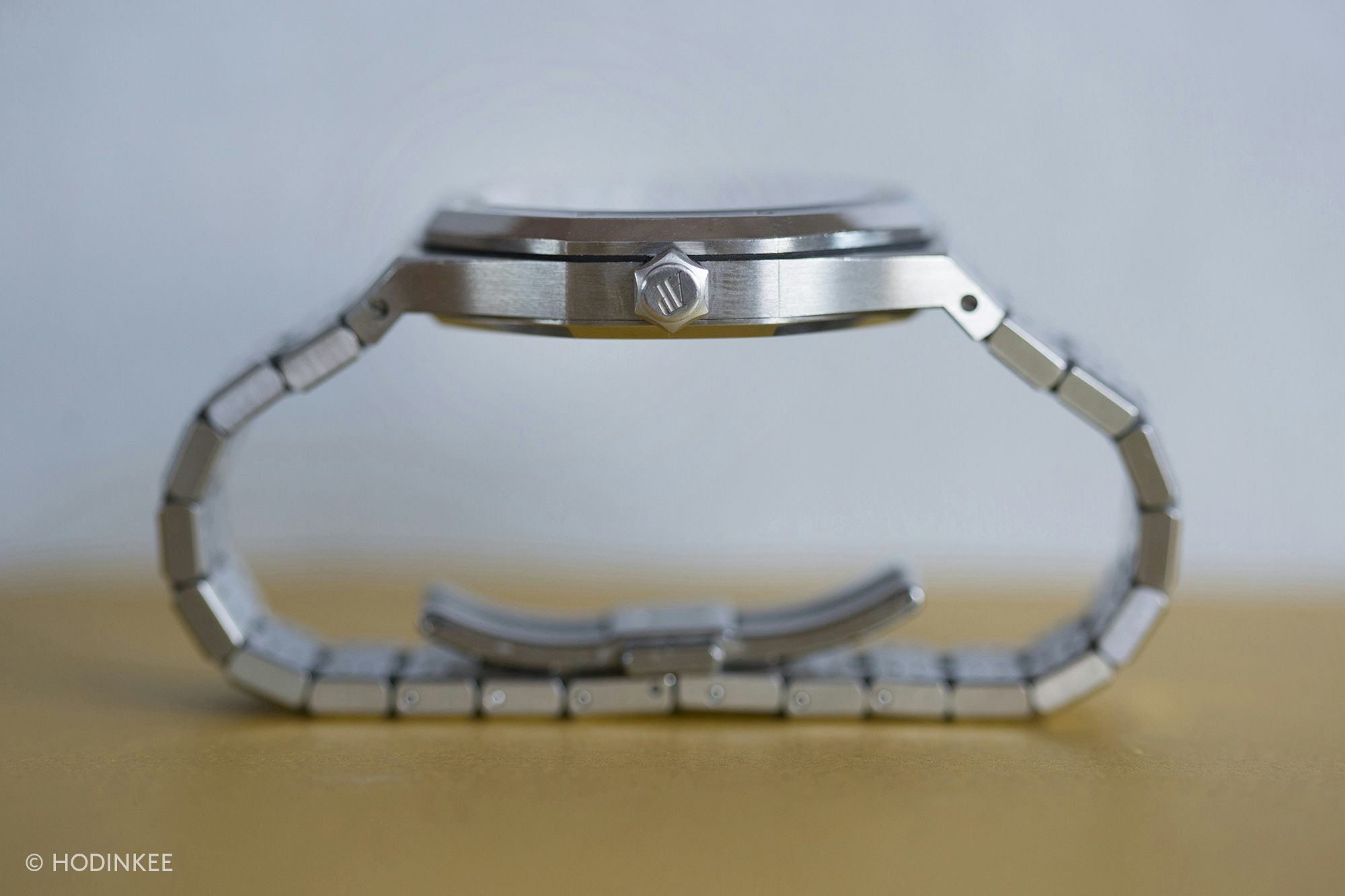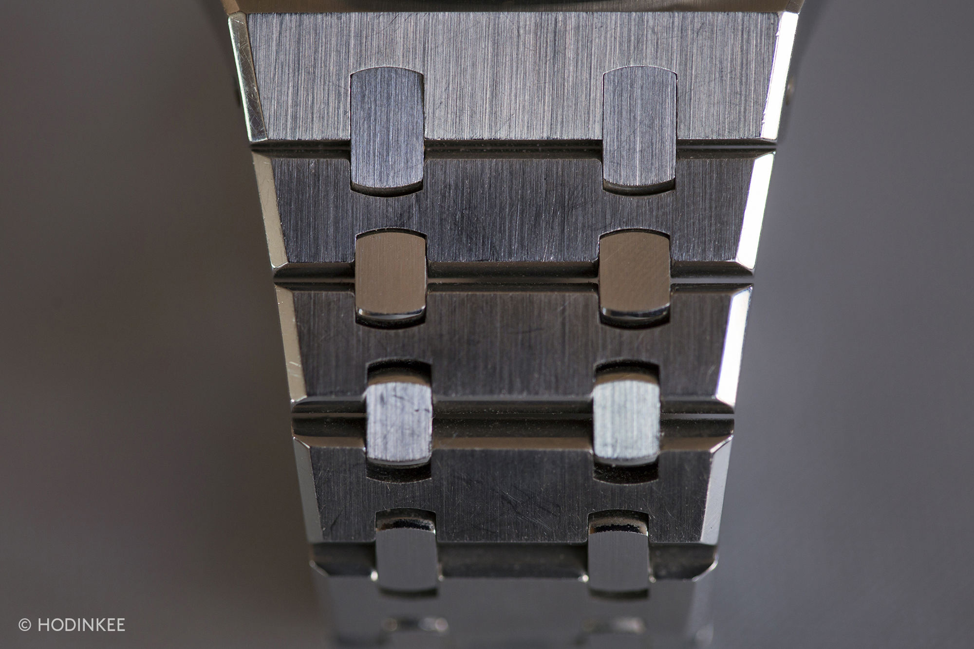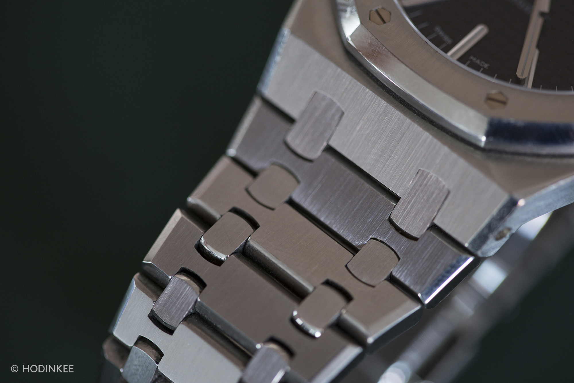 ブレスレットのデザインはパラドックスに根ざしています。それは同時に剛直で柔軟性があり、男性的でエレガントで、カジュアルで豪華です。すべてを一度にしようとすることの問題は、もちろん正しいバランスを見つけることです。ここでは、リンクの形状と自然な重さがブレスレットのしっかりさを示しています。ブラシ仕上げはAPの生産ラインの近代化の兆候ですが、ブレスレットのテーパと側面の微妙な研磨は、同社の伝統的なルーツを思い出させます。
