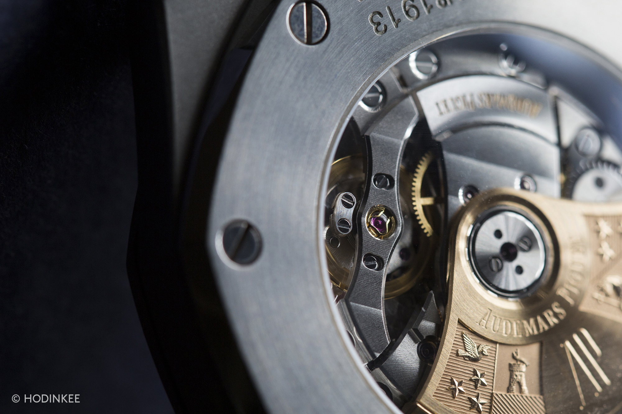 グリルのようなタピソリーは、実際には、有名なGenevois(ジュネーブ)のダイヤル・メーカー、Roland Tille(ローランド・ティル)によって作られました。そして、パンタグラフ・エンジン・ターニングと呼ばれる非常に古い学校の装飾技術を使って実現されています。Tille(ローランド・ティル)がそれを使用してダイヤルを埋める方法は、斬新なものです。直線的なカットは、同じツーリングを使用して達成できる装飾のタイプ(ロイヤルオーク前後のAPコレクションの他のモデルにもあります)と比較して非常に工業的ですが、まさにこの伝統とのブレークですジェラルド・ジェンタがロイヤル・オークのためにそれを選んだときに歓迎されました(ロイヤル・オークスには細い線が付いていて小さな正方形が付いた小柄なタピソリーダイヤルがありました)。パンタグラフの仕組みはここで見ることができます。