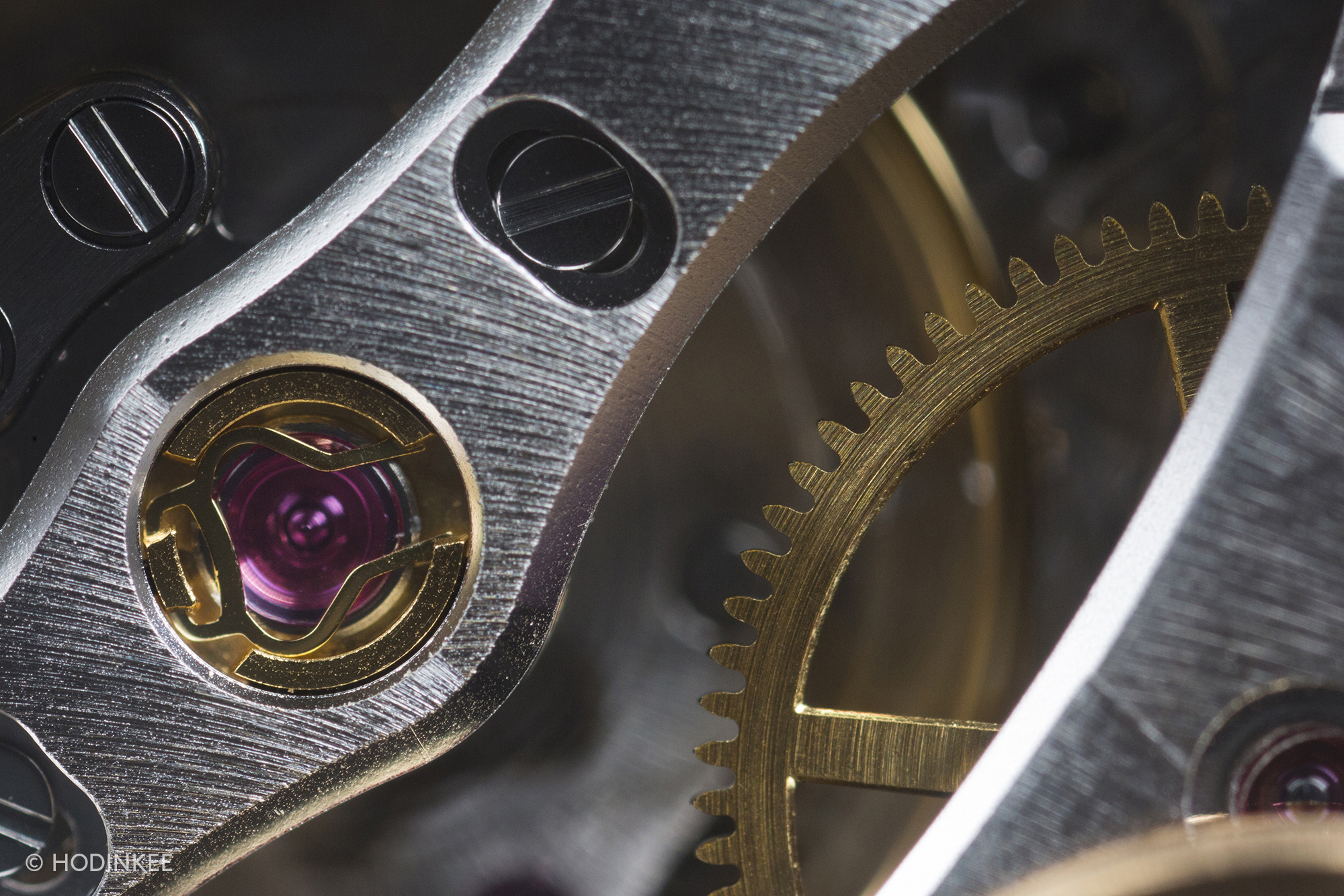 ![]() 効率性はこのキャリバーの主な関心事です。美しい形の橋の下にある非常に大きなバランスホイールと、より大きなバレルを、コンパクトで、構造的に健全で、よく飾られた動きに詰める方法を見つけます。