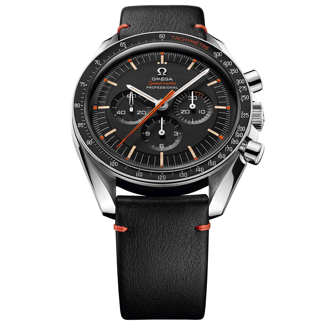 「スピードマスター」という言葉もオレンジ色です。オリジナルの時計とその名前にインスパイアされたテレビシリーズのもう一つの賛辞は、ウルトラマンの頭のシルエットで、9時に小秒の小秒(スモールセコンド)です。