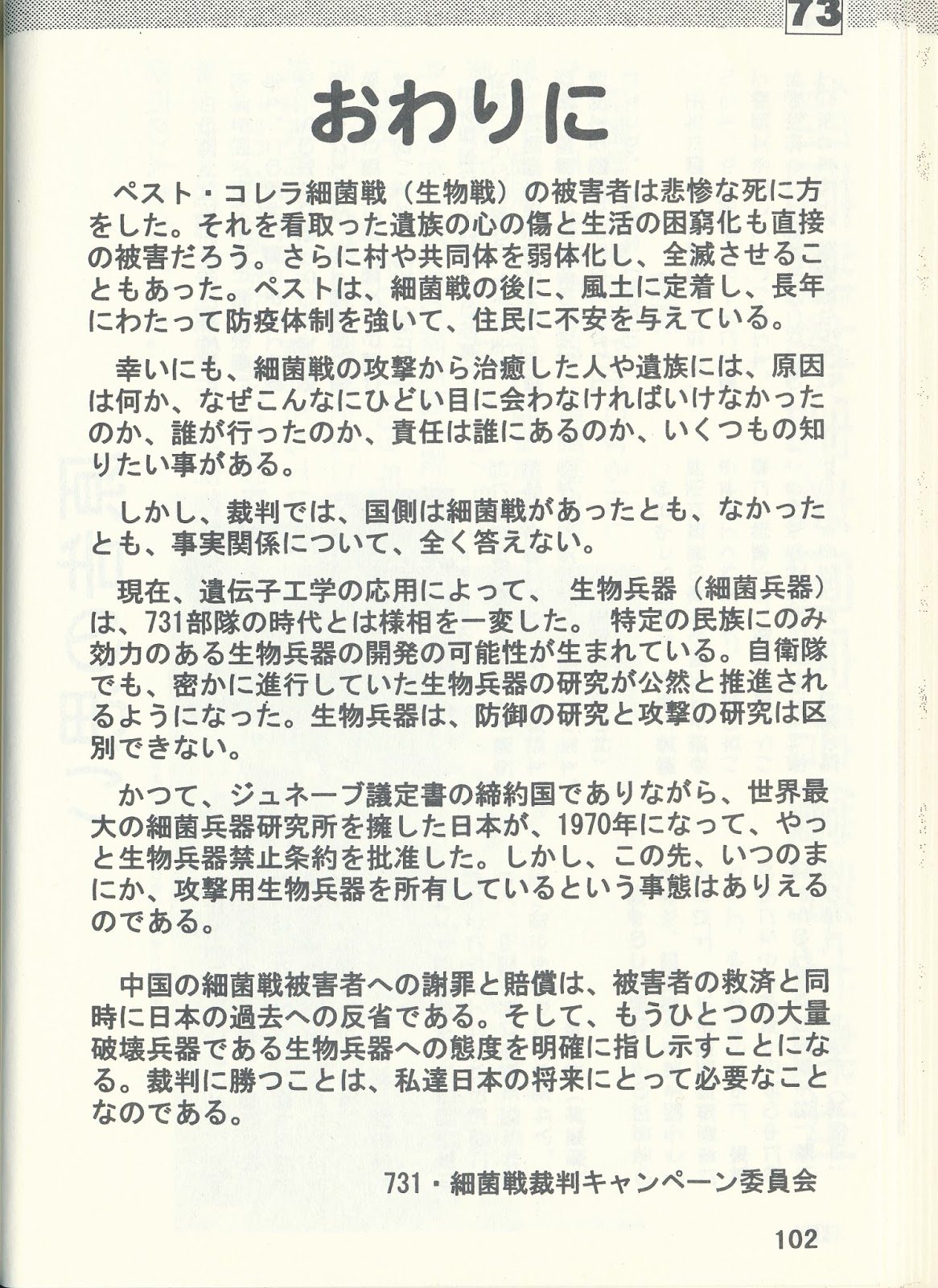 秋山 浩著 (三一書房 1956年6月30日 発行) 第2部 恐るべき遠足 死体を解剖して、肺臓、脾臓など各部分からそれぞれ検査用塗抹標本を作る手伝いをさせられたのだったが、与えられた仕事を理解しようとする心のゆとりもなく、ただ反射的に手を動かしていた。周囲の壁を通して悲痛なうめきが聞こえ、金網の外には、取り出した臓腑をかぎつけた蠅どもがうなっている。 わずか1時間足らずの時間だったろうが、私は体も神経も蒸されたようにふらふらとなって部隊に帰った。 部落は一週間ほどたって全部焼き払われた。中には生き残った者もあったろうが、極秘の実験であるから、実験後には一人残らず殺されたのだそうである。 黒い太陽731 悪魔の飽食:復号731 ・中国には、細菌戦の影響と思われる、原因不明の病気に悩んでいる人々が今も数多くいる!! ・戦時中に起きた食中毒・赤痢の事件・事故と新宿の軍医学校(731)の関係は??軍医学校は強毒のゲルトネル菌の研究開発を進めていた?? 実際に、中国広東の南石頭の難民収容所で、陸軍防疫研究室が製造したゲルトネル菌が使われ、多くの難民が亡くなっている。 1935年(昭和10年)・・・鳥取で食中毒発生(4人死亡)、ゲルトネル菌の免疫血清を持っていたのは、陸軍軍医学校(西俊英) 1936年(昭和11年)・・・浜松で食中毒発生(患者数は2250人、46人が死亡)、原因ゲルトネル菌、防研嘱託(731)小島三郎、石井四朗、北野政次、西俊英がこの問題に取り組む。 紅白の殺戮者 1937年(昭和12年)・・・大牟田爆発赤痢事件(患者数は12332人、712人死亡)以下の事は関係ないのか? 事件当日の三井三池染料工業所における爆発事故 また当時の新聞記事や調査において、 三井三池染料工業所において、事件発生当日の午後6時と26日午前0時20分の2度にわたり爆発事故があったこと 2度目の爆発では市消防組が消火に駆けつけたが会社は消防組の入所を拒否したこと 患者はまず咽喉を侵されたこと(赤痢ならば咽喉がやられることはない) 市内で人々が次々と倒れた時間帯と工場で爆発事故があった時刻が符合すること などが分かっている。 当時の時代背景として、2ヶ月前には満州事変が勃発して戦下の色が濃くなってきており、事実この工業所では枯葉剤、合成染料など軍需製品の製造を行なっていた。このため、軍と三井が工業所内で秘密裡に赤痢爆弾を製造しており、それが間違って爆発したのではないかとする説がある。 しかし、仮にクシャミ性毒ガスの製造工程で爆発事故があったことが原因としても、住民の便から赤痢菌が検出されており、また調査に参加した各大学が患者の便から検出した赤痢菌がそれぞれ異なった種類であったことが分かっており、疑問が呈されている。 一方こんな説もある。毒ガス爆発をカモフラージュするため、軍医学校が、赤痢予防錠を配ったというもの?? (参考)『陸軍軍医学校50年史』(1936年) ![]() ・三井という会社 毒ガスを、戦前は大量に作り、戦後も枯葉剤を作っていた!! ベトナム戦争の枯れ葉剤の原料を三井東圧が大 イタイイタイ病を究明した萩野医師に圧力をかけた三井財閥とそれに協力した医学界の権威者たち 萩野 昇(富山のシュヴァイツァー) 2015年 偉人医 ・ 萩野昇 萩野昇(富山のシュヴァイツァー) 富山平野の中央部を流れる神通川は昔から「神が通る川」として地元の人たちから崇められていた。住民たちは神通川のサケやアユを食べ、神通川の水を農業用水として利用し、また水道が普及するまでは生活用水として住民たちの喉をうるおしていた。この北アルプスから流れ下る神通川が、いつしか「毒の通る川」に変わっていたのだった。イタイイタイ病はこの神通川上流にある神岡鉱山から排出されたカドミウムによって引き起こされた公害病であった。 共同研究の結果 共同研究班は原因を解明したとして解散となり、萩野はひとり残されることになった。「イタイイタイ病の原因が栄養不良、過労、ビタミンD不足のはずはない」このことを地元の医師である彼が一番よく知っていた。しかし農民たちは萩野がよけいなことを言ったからだと憤慨した。地元の反発もあり、萩野は孤立無援のなかで独自に研究を進めることになった。共同研究の成果はなかったが、世界的な学者が取り上げたことから、イタイイタイ病が日本中に知れ渡たり、さらに萩野が世の注目を集めることになった。 細谷省吾 護衛艦などを作る!!軍需会社!! 三井造船が建造した船舶 三井造船、防衛省から新型潜水艦救難艦を受注 = 日本工業新聞 ・パネル展(731細菌戦) ![]() 中国は生物兵器を持っていないが、かつて生物兵器の被害国である。 ・細菌戦最大の被害地・浙江省を訪ねるスタディツアー ![]() 2016年10月24日 衢州(くしゅう) ![]() ![]() 2016年10月25日 麗水 (れいすい) 2016年10月25日(火) 麗水№2 2016年10月26日(水) 四路口(しろこう) ![]() 2016年10月27日(木) 武義、金華石門 2016年10月28日(金) 金華市街 2016年10月29日(土)義烏市崇山村 台湾義勇隊(金華 ) 台湾義勇隊(上)抗日戦争:細菌戦 台湾