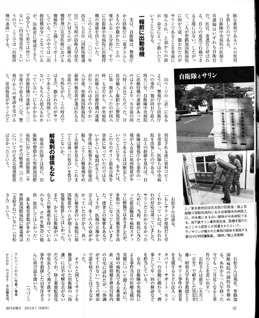 ●731部隊の実態 ●『陸軍軍医学校50年史』(1936年)より ●あなたの住む地域で、「731部隊展」を開いてみませんか? ●731部隊展 ●「重慶大爆撃」を描く!!「日本は恥じるべき加害国」 ●自衛隊と日航機墜落事故の関係は?? ●サリン事件と自衛隊の関係は?? ●不二越強制連行問題!! ●「福島の今」 ●結核予防接種と人体実験 ●731部隊(2) ●731部隊(3) ●BS1「731部隊」後編 BS1スペシャル「731部隊 人体実験はこうして拡大した/隊員たちの素顔」(前編) 20180121 20180121-BS1スペシャル「731部隊 人体実験はこうして拡大した/隊員たちの素顔」[後編] 西山勝夫(滋賀医科大学)さんの解説 前編が、ハバロフスク裁判の音声記録や米ソとの関わりを中心とした部隊の設立の全貌について、後編が、自死したと伝えられる柄沢被告のご遺族や少年隊の方々を中心とした内容で、隊員の素顔をお伝えしながら、彼らを取り込んでいったシステムについて伝える内容 「ハバロフスク裁判は強制による虚偽である」または、「731部隊の事実はなかった」等の批判に対して、私たちがわかりうる範囲で、事実や資料を提示することに徹している。 後編においては、ひとりの医学者でもあった隊員が、人体実験に手を染めていったのはなぜかということをテーマとし、システムやお金等による強力な取り込む力・権力に対して、あらがえない個人という、現代にも通じるものを感じながら、制作された。 NHKの解説 戦時中、密かに人体実験を伴う細菌兵器の開発を進めた731部隊。新たに発掘した音声記録と数百点の資料から、部隊がどう作られ、人体実験はどのように拡大したのか迫る。 番組内容 戦時中、旧満州でひそかに人体実験を伴う細菌兵器の開発を行った、731部隊。NHKが発掘した、旧ソ連・ハバロフスク裁判の音声記録では、部隊幹部らが、日本に反発した中国や旧ソ連の人々を、実験材料としていた実態を克明に語っていた。731部隊はどのようにして設立されたのか。人体実験はどう拡大していったのか。そして米ソの対立の中で、731部隊の歴史はどう封じ込まれてきたのか。音声記録と数百点の資料から迫る。 ●情報公開!! 特定秘密保護法撤廃!! ・次回情報公開裁判(「化学学校記事」)第6回 2018年4月18日(水)11:30〜東京地裁522号法廷 いったい化学学校とはどんなことをやっているところなのだろうか? なぜ、大宮の化学学校で出している機関誌『化学学校記事』がいつまで発行していいたのかが、当事者の被告防衛省はわからないのだ??? 余りにもおかしな話である。防衛省は、部内を大人数で調査したと言うが、何でこんなことも分からない?? 調査の報告書を作成した部署の責任者の話を聞きたい。 化学学校は1957年8月に創設され、『化学学校記事』は1959年12月に創刊された。 『化学学校記事』8号(1964年2月)には、「ガス害を利用する装面訓練」・「広島における原子爆弾の体験を顧みて」とか、9号(1965年4月)には「生物戦」「原子武器の効果と防護」などの記述がみられる。 1997年には『化学学校40年のあゆみ』が出され、創刊号の表紙が掲載されている。これは何を意味するのだろうか?? ![]() ![]() 長春にあった軍馬防疫廠100部隊で人体実験をした獣医たちの戦後の流れはどうなっているのだろうか?まさか加計学園に流れている?? ・「衛生学校記事」情報公開裁判 裁判長も被告防衛省側の期間・人員を多く使って調査した概括的な報告書の具体的な説明を求めたが、防衛省側は具体的な説明はしなかった。 また、「衛生学校記事」の後継である「ふかみどり」の編集に携わった人に、いろいろと問い質したら、いろいろな事も分かるだろうと原告側は主張し、被告側も応じる姿勢を見せた。次回は、2月8日に裁判の進行協議をするという。 防衛省内の機関で正式に予算を取って、作られていた機関誌を、簡単に行政文書でないからと言って、廃棄していいものだろうか?? 防衛省は言う、「確かに,発刊当時の昭和32年当時においては最新ともいえる医学領域等を中心とした学術情報も掲載されていた可能性はあり得る。しかしながら,学術・科学が日進月歩する中にあって、半世紀前に発刊された機関誌をなお、組織として保秘しておくべき要請は全くなく」と。 然し、国民の税金で作ったれっきとした機関誌であり、公文書である。どんな研究をしてきたかを書いた大事な機関紙である!! 自衛隊の研究成果は、国民にもきちんと知らせるべきである。 防衛省は強いて言えば「衛生学校記事」「化学学校記事」を図書であると言いながら、行政文書として扱って捜し、図書館・図書室などをきちんと探していないようだ。自衛隊の機関の研究内容は、より透明性が必要だ!!また、衛生学校長であった金原節三氏の遺族から寄贈された資料に関して、衛生学校や防衛研究所図書館への資料の移管に関する記録も存在しないと公然と主張する!!寄贈されたものを、こんな杜撰な管理の仕方でいいのだろうか??機関誌を情報公開法の行政文書として扱うのではなく、歴史的に