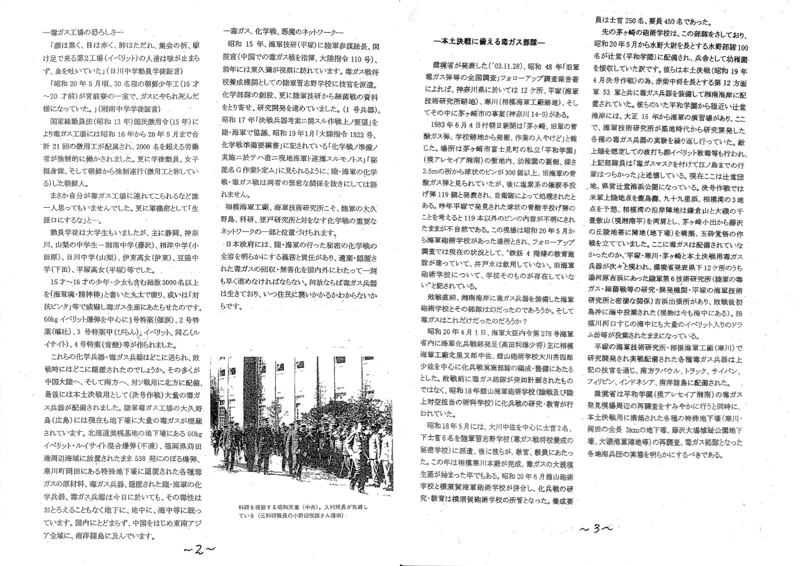 BS1 「731部隊」 西山勝夫(滋賀医科大学)さんの解説 前編が、ハバロフスク裁判の音声記録や米ソとの関わりを中心とした部隊の設立の全貌について、後編が、自死したと伝えられる柄沢被告のご遺族や少年隊の方々を中心とした内容で、隊員の素顔をお伝えしながら、彼らを取り込んでいったシステムについて伝える内容 「ハバロフスク裁判は強制による虚偽である」または、「731部隊の事実はなかった」等の批判に対して、私たちがわかりうる範囲で、事実や資料を提示することに徹している。 後編においては、ひとりの医学者でもあった隊員が、人体実験に手を染めていったのはなぜかということをテーマとし、システムやお金等による強力な取り込む力・権力に対して、あらがえない個人という、現代にも通じるものを感じながら、制作された。 731部隊展 ABC企画委員会 NHKの解説 戦時中、密かに人体実験を伴う細菌兵器の開発を進めた731部隊。新たに発掘した音声記録と数百点の資料から、部隊がどう作られ、人体実験はどのように拡大したのか迫る。 番組内容 戦時中、旧満州でひそかに人体実験を伴う細菌兵器の開発を行った、731部隊。NHKが発掘した、旧ソ連・ハバロフスク裁判の音声記録では、部隊幹部らが、日本に反発した中国や旧ソ連の人々を、実験材料としていた実態を克明に語っていた。731部隊はどのようにして設立されたのか。人体実験はどう拡大していったのか。そして米ソの対立の中で、731部隊の歴史はどう封じ込まれてきたのか。音声記録と数百点の資料から迫る。 BS1スペシャル「731部隊 人体実験はこうして拡大した/隊員たちの素顔」(前編) BS1スペシャル「731部隊 人体実験はこうして拡大した/隊員たちの素顔」(後編) NHKスペシャル「731部隊の真実〜エリート医学者と人体実験〜」 ※1949年のハバロフスク裁判の録音テープが見つかった!! ●731部隊について 「731部隊の真実〜エリート医学者と人体実験」起こし タイトル 「731部隊の真実 〜エリート医学者と人体実験〜」 ナレーション 中国東北部にある都市ハルビン。ロシア人が建設したこの国際都市は、戦争中、日本軍の拠点となっていました。 ハルビンの郊外20キロ、731部隊の本部跡が今も残っています。破壊された建物の残骸、終戦間際、存在を隠すために爆破されました。 当時の写真です。 部隊は、周囲数キロに及ぶ広大な敷地で、極秘に研究を進めていました。四角い形の3階建てのビルには、冷暖房を備えた最先端の研究室が並んでいたといいます。 その中央に周囲から見えない形で牢獄が設置され、実験材料とされていた人々が捕らわれていたといいます。 731部隊が編成されたのは1936年。当時の日本は旧満州に進出、国境を接し、軍事的脅威となっていたソ連に対抗するため、細菌兵器を開発していたのです。 部隊を率いていたのは、軍医・石井四郎です。 当時、細菌兵器は国際条約で使用が禁止されていました。 しかし、防衛目的の研究はできるとして開発を進めました。 部隊の人数は最大3000人。【竹田宮を中心とする731部隊の集合写真】 石井は、細菌兵器開発のため、全国の大学から医学者を集めていました。 「731の問題」−戦中・戦後ー奈須重雄 2018.4.29 ※吉村寿人 ※戸田正三はじめ、京大・東大の医学者の多くが731の仕事に係わった。そして戦後の日本医学界にも大きな影響を与えた。 731部隊で行われた人体実験・細菌戦などは国家機密だったため、携わった医学者は誰一人声高に叫べず、自責の念のあるものは、自殺した。日本政府・医学界は、731部隊の罪業を、いまだに反省・謝罪していない!! 今の日本医学界に、この影響がないのだろうか??? ※清野謙治京大教授も、京都大学での愛弟子にあたる石井四郎が部隊長だった満州731部隊に対しては病理解剖の最高顧問を務め、人材確保・指導などに「異常なまでにてこ入れした」とされる。 ※清野事件 清野は、幼少の頃から考古学を趣味にしており、仕事の傍ら古人骨・古文書・民俗学資料などの収集に情熱を傾けていた。 1938年に医学博士号を取得した直後、「誠に奇妙なる精神状態」のうえに収集癖が高じて、京都の古寺から教典や古文書を盗む窃盗事件を起こす。 清野は逮捕され、控訴審で懲役2年執行猶予5年の有罪判決を受ける。 このことから清野は京大を免職になったばかりか、濱田耕作京大総長も辞意を表明した。 記者会見 :研究者が戦争に協力するとき 2018.4.14(京都大学) ※1938年8人の京大研究者が731部隊に派遣される。 8人は石川太刀雄丸、岡本耕三、林一郎、田部井和、湊正男、吉村寿人、斎藤幸三郎、田中英雄 凍傷実験で有名な吉村は、日本学術振興会から研究資金が出ていた。 吉村の恩師は、正路倫之助【軍医学校(731部隊に指令を出していた所)の嘱託】。正路は1946年に、兵庫県立医科大学の学長に就任する。そこに戦後、吉村、岡本、田部井が職を得る。兵庫県立医科大学は、後に神戸大学医学部になる。 岡本は清野の弟子、田部井は木村の弟子だっ
