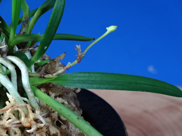 今回の株には花軸にもう一つ蕾が出ていますので、二つの開花が楽しみです。