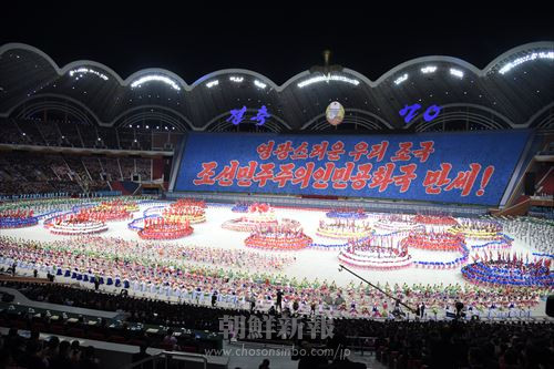 絶賛上演中の大マスゲームと芸術公演「輝く祖国」 夜8時からは、金正恩時代に初めて創作された大マスゲームと芸術公演である「輝く祖国」がメーデースタジアムで初上演されるなど、終日祝賀ムードに包まれた。
