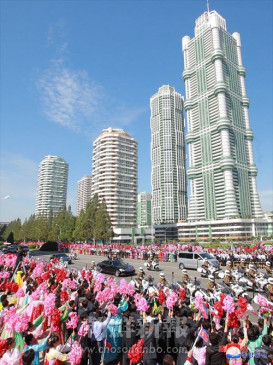 巨大国旗の「正体」本紙取材班は人波をぬうようにして金日成広場まで歩いた。花束などのアイテムを手にした人々の表情は明るく、若干の緊張感も伝わってきた。