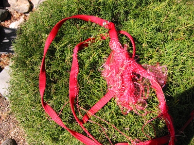それは、今日の朝の出来事。 今日は朝から天気が良いので、チポンちゃんを外につないで遊ばせていました。 時間にして30分。(一人で遊ぶ) 「さ〜って、散歩に行こうか〜 チ・ポ・ン うん〜?」 ☆ ☆ ☆ ☆ ☆ ☆ ☆ 目が点になる。 っそ、それはないんじゃ〜ないかい。 「オイ!こらぁ〜!!」 心の中で叫ぶ・・・ 誕生日プレゼントに買って上げたリードが、見るも無惨にずたぼろっす。 一人でお外に居るのがイヤにしても、そこまでやらなくてもね〜 まったく〜反省してるかい!? し〜かし、その顔は・・・ ふぅ〜 また、ネットで注文するか。