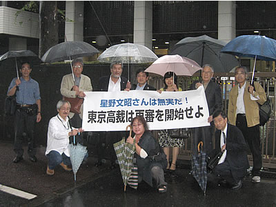 “供述調書の信用性全くない” (写真 東京高裁への補充書提出に集まった弁護団、星野暁子さんとともに【9月30日】)