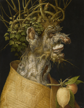 【四季・春】は美しい花々で描かれているから、まあ、いいとして、 【四季・冬】なんかは、古い大木の幹が顔になっているなんて、尊敬の念が入っているなどとは思えない。 しかし、これはどうやら、風刺画なんかじゃないみたいで。 そう、これを描いていた時、アンチンボルドは宮廷画家だった。 そんな人が描く絵なのだから、これは間違いなく、君主への礼賛画なのである。 (もちろん、彼の心の中まではわからないけれど、25年間もその地位にいたのだから、ねえ) 当時の王侯貴族の間では、優れた芸術品や様々な珍しい自然物(動物や植物から、人間までをも含む!)の収集が流行していた。 ※う、これは私の好きな「驚異の部屋〜ヴンダーカンマー」のことだ。 私がアンチンボルドに惹かれるのも無理はない。 彼らにとって、このような収集は、世界を手中に収めるのと同義だった。 脈絡があろうがなかろうが、集める価値があろうがなかろうが、とにかくありとあらゆる珍しいものを手にするというのは、権力、地位、財が無ければできないことなのである。 ただし、これはあくまでゴミを集めればよいというものではない。 いや、仮にゴミだとしても、それを蒐集しておく部屋や館は、それなりに豪華でなければいけないのである。これが博物館の始まりですからね。 あ、これはなんだか、「美術館やギャラリーに展示されるものがアートである」のと一緒だ。「箱に入れられてこそアートになる」いや、コワイですね。 …と、だんだんワケのわからない内容になってしまったが。 皇帝たちは、これらの肖像画を気に入り、何度も描かせたくらい。 ポスターの右側の絵だって、80種類もの花々によって描かれている。 動物によって描かれた肖像画もしかり。 つまり、アンチンボルドは、その宮廷画家という立場にあるからこそ、宮廷内の植物園やら動物園やら珍しいコレクションの数々を直に見ることが出来、それによって、はじめてこの絵が描けたのである。 絵が描かれた背景を知ることによって、 初めて、絵が風刺画なんぞではなく、礼賛画だということがわかる、という、 なんだか、ありがちな、けれど、大事な、お話。 |