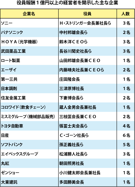 2010年3月期から、有価証券報告書に年1億円以上の報酬を受け取る役員の情報を記載するように義務付けられた結果、大半の企業は株主総会後にしか報告書を提出しないが、総会では株主から報酬額を巡る質問が相次ぎ、明らかにされた。