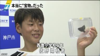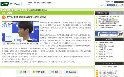 うれしいそうです。 将来は 考古学者になりたいという少年、 夢がかなうと いいね。 【文化】 近所の公園で見つけた少年の宝物、 実は国の重要文化財だった…古墳時代の青銅鏡、神戸市から感謝状 2013年10月09日 http://blog.livedoor.jp/waruneko00326-002/archives/32926081.html 神戸市の小学6年生の男の子が、4年前に自宅近くの公園で見つけて「宝物」として保管していた破片が、国の重要文化財に指定されている古墳時代の青銅鏡の一部だったことが分かり、8日、神戸市から男の子に感謝状が贈られました。 感謝状が贈られたのは、神戸市灘区の西灘小学校6年の佐野翔梧君です。 佐野君は、3世紀後半の「西求女塚古墳」がある自宅近くの公園で、4年前の平成21年1月、長さ5センチ、幅3センチほどの青色の破片を見つけ、「宝物」として机の引き出しで保管していました。 しかし、ことしになって小学校の社会の授業で学んだ古墳時代の青銅鏡に似ていることに気付き、小学校を通じて市の教育委員会に申し出て、専門家による調査が行われました。 その結果、昭和61年に「西求女塚古墳」の調査で、一部が見つかり平成17年に国の重要文化財に指定された「西求女塚古墳1号鏡」の破片だったことが分かったということです。 佐野くんは「公園で見つけたときからすごいものだと思って大切に保管していましたが、謎のかけらが歴史的な発見だと分かって、とてもうれしいです」と話していました。 この破片は神戸市に寄贈され、今月16日から市の埋蔵文化財センターで展示されることになっています。 http://livedoor.blogimg.jp/waruneko00326/imgs/c/3/c348ccb0.jpg