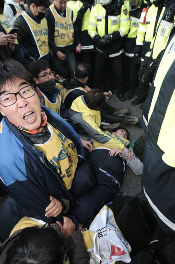 警察の強制解散により午後5時30分現在、 集会場所は孝子路の4車線から2車線に縮小された。 衝突は現在小康状態で、非正規職労働者たちは残った2車線で集会を続けている。