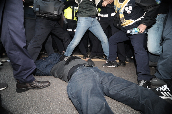 警察が11月12日、 青瓦台近隣で開かれた非正規職労働者集会を暴力的に解散する過程で 3人が大怪我をした。