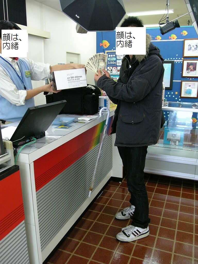 去年の12月に、 自分がそそのかしてキスデジXを12万で買わせた友達のS君ですが、 その後は順調にカメラにはまってくれております(笑) 最近の悩みは長いレンズが欲しい、ということだそうで・・・ 昼過ぎから、写真プリントついでにキタムラへ行ってきました。 値段的に70-300にしようとしていたS君ですが、 どうせ買うならLレンズで望遠の効くのが良いでしょうと 100-400を自分は勧めていました(笑) 値段が値段なので彼も悩んでおり・・・ 「Lレンズ良いよ〜」とか、「せっかく買うなら高いのの方が良いよ〜」 と悪魔の囁きを彼に語りかけていました(笑) 店員さんに声掛けて、実機触らせてもらっていました。 その約1時間後。 中に居るのはS君。あれ・・・、何してんの?? http://image.blog.livedoor.jp/tecchanshinkansenku_2/imgs/2/e/2ef8a655.JPG?blog_id=523012 はい、今回もS君を男にしてしまいました〜(爆) http://image.blog.livedoor.jp/tecchanshinkansenku_2/imgs/8/5/85f9d613.JPG?blog_id=523012 今回のお買い物ですが、EF100-400 F4.5-5.6L+レンズフィルター、 カメラバッグ、三脚の3点です。 20万ポッキリにしてもらいました(笑) 結果、1万ちょっと値切った計算です。 アパートに戻って早速・・・(笑) http://image.blog.livedoor.jp/tecchanshinkansenku_2/imgs/c/2/c2eddfd4.JPG?blog_id=523012 直進ズームなので、やはり普通のレンズとは印象が違います。 その後は、天気がイマイチでしたが、 カメラを持って2人で出掛けました(笑) |