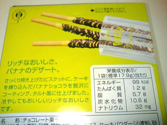とわちゃんの記事 グリコ「つぶつぶブルーベリーポッキー」 を見て 絶対これ食べたぁ〜い!! と、勢い込んでローソンに行ったのですが、売っておらず その代わりに、「バナナショコラのタルト風」というデザートポッキーを見つけました♪ ポッキーも随分と種類が増えましたねぇ♪ こういうものの値段って気にせず買っちゃいます;http://oyaji3.com/b/dpbct01.jpgチョコ好きの人間にとって、値段が高いか安いかなんて無関係です!