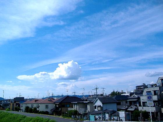 筋状の雲もありましたが、あちこちに入道雲が出来ていて 上空へ上空へと突き上がっていく様子が見れました♪ 撮影方向は、大阪梅田方面(東方面)を写しています。 中央下の電柱は、実は昨日の淀川の花火大会の写真で 花火の前に邪魔っけに写っていた電柱です(笑) ●撮影場所http://slide.alpslab.jp/fslide.swf?pos=34%2F44%2F51.746%2C135%2F26%2F56.088&scale=25000&link=base★Yahooブログの負荷低減には画像縮小ソフトを使おう★■この記事に掲載している画像(写真)は