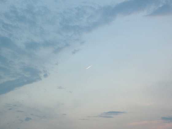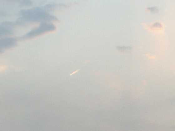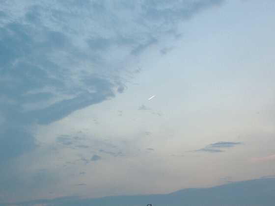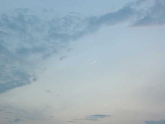 ちょうど写真の中央に写っている小さな雲の左下に 小さな斜め下に向かう白っぽい光が見えませんか? 2枚目の写真が、そのズーム写真です。 飛行機の速度よりは、はるかに遅くて とてもゆっくりと白い尾を引きながら落下しているように見えました。 この時点では、まだ「飛行機」だと思っていたのですが・・・・ これが2度目の遭遇時の連続写真です。 1度目の遭遇から数分は経ったあとに、また見たのです。 1枚目から4枚目の写真まで、ゆうに1分以上は時間がかかっています。 飛行機だともっと速く通り過ぎますので、飛行機では無いような気がするのです。 人工衛星だとしても、このような飛行機雲?を出すのでしょうか? 不思議です。 今回も見事に狙って撮影出来ました♪
